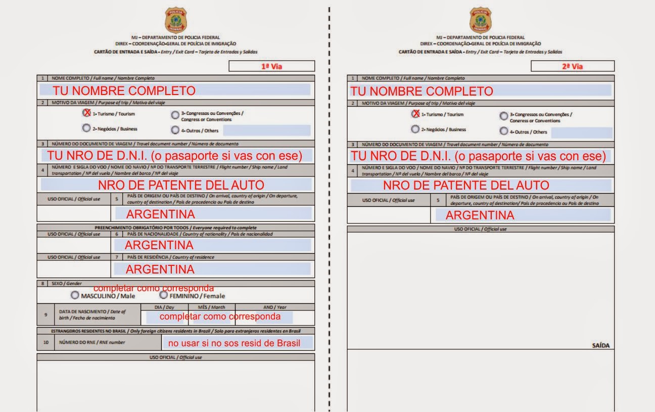 En Migraciones del lado Brasil te harán completar un formulario de visado llamado TARJETA DE ENTRADA Y SALIDA (cartao de entrada e saida) por cada persona que viaje.