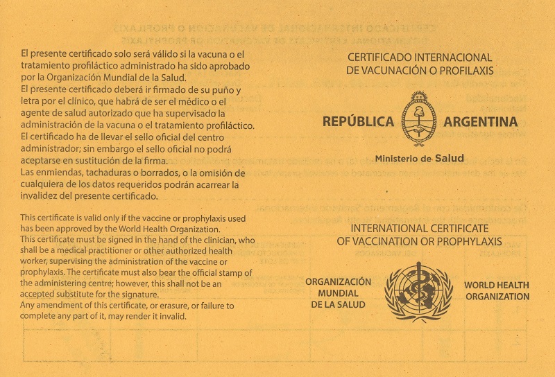 • En cumplimiento con el Reglamento Sanitario Internacional, la vacunación siempre deberá ser asentada en el certificado internacional de vacunación. El Certificado debe ajustarse en todo al modelo y contenidos mencionados en el RSI, siendo indistinto el color, gramaje y tamaño del papel utilizado en la confección del mismo. El Certificado Internacional se utilizará para registrar la vacunación como así también la exención.